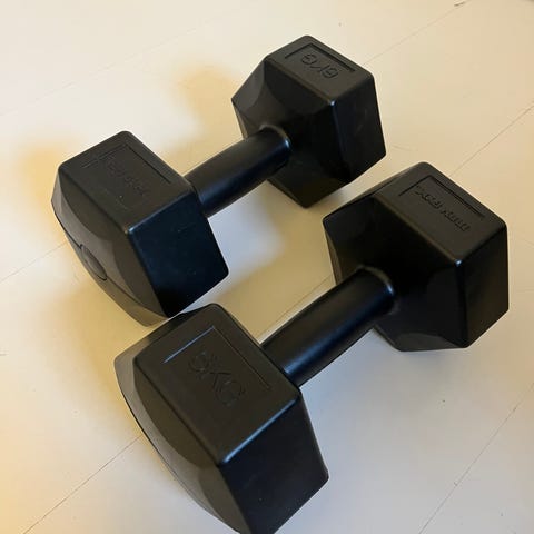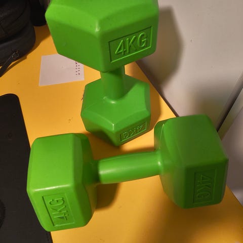 Dumbbell käsipainot, yhteispaino 9 kg, 2 x 4,5 kg painoiset. Väriltään vihreät, valmistettu muovista. Sopivat kotiharjoitteluun ja lihaskuntoharjoituksiin.