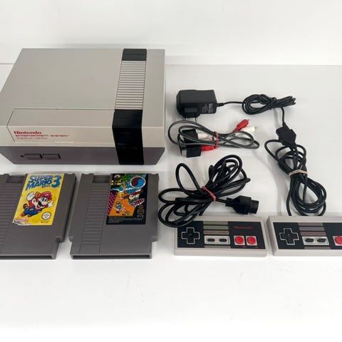 Pahveissa oleva NES pelikonsoli zapperilla ja 10kpl pelejä mukaan
