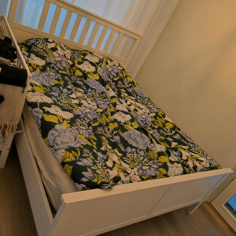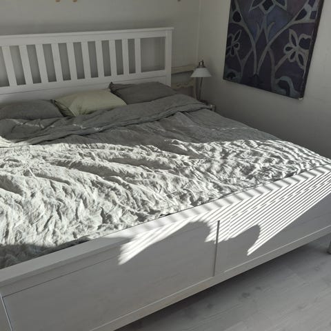 Valkoinen Ikea Hemnes runkosänky kahdelle. Mukana säleiköt. Ei patjoja. Pääsyssä muutama kolhu, jotka näkyvät kuvissa. Patjojen korkeuden voi säätää. Runko ollut nyt alimmalle tasolle viritettynä. Tarkemmat tuote tiedot https://www.ikea.com/fi/fi/p/hemnes-saengynrunko-valkoiseksi-petsattu-loenset-s29019056/