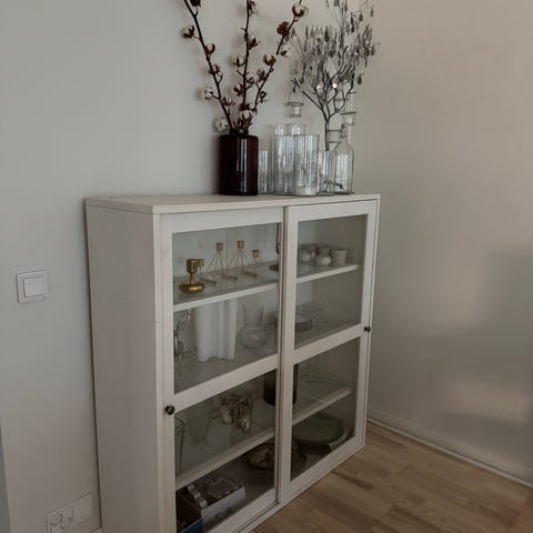 Myydään valkoinen Ikea Havsta vitriinikaappi liukuovilla. Nouto.