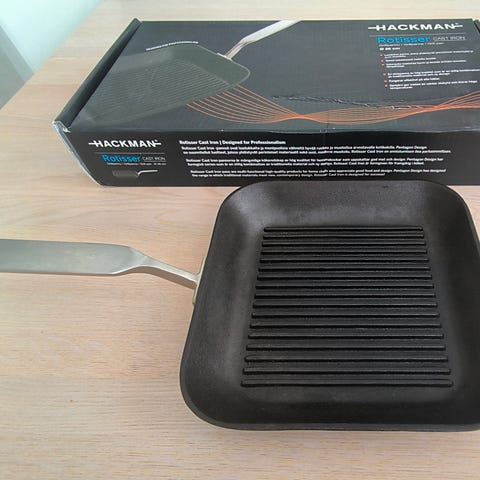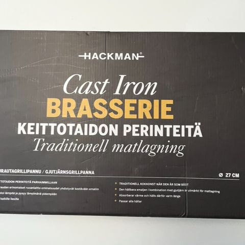 Hackman valurautainen 27cm grillipannu, puisella jahvalla. Pohjan halk. 22cm. Kunto kuin uusi. Kahvassa muutama pienehkö kolhu. Itä-Helsinki. Ensisijainen nouto.