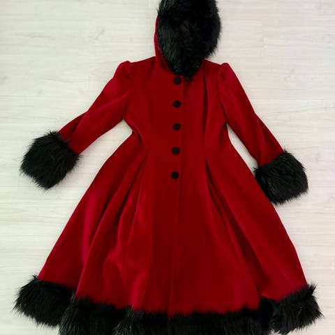 Supernaisellinen mekkomallinen hupputakki, tekoturkisreunukset hihoissa ja hupussa. Kaunis, pintakuvioitu villakangas, rusettisomisteet takana ja taskunsuilla. Kaunis leikkaus, vastaa kokoa 40.