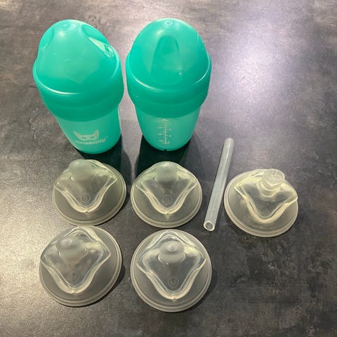 1kpl ainu trainer pullo, johon 2kpl käyttämätöntä tuttipullosuutinta, ja 1 käyttämätön trainer suutin.
