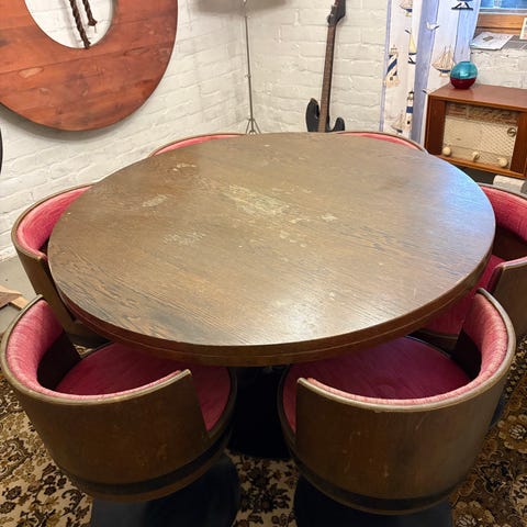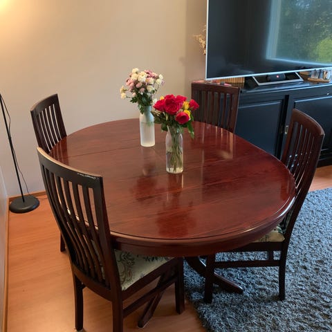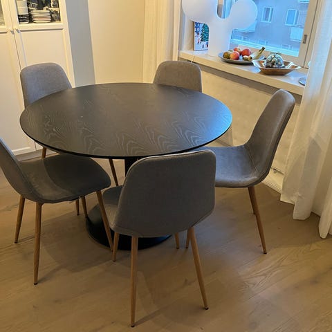 Kiiltomusta puinen ja jykevä pyöreä keittiön pöytä. Pöytään on suora n. 50cm jatko-osa keskelle. Ryhmään kuuluu 8 kpl kuvan mukaisia tuoleja. Pöydässä ei ole selkeitä naarmuja, mutta kiillossa ja tietyssä valossa näkyy naarmuja. Tuolissa ja pöydässä on käytön jälkiä.