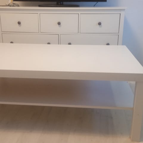 Myydään sohvapöytä säilytystilalla, jossa kannet aukeavat sivuille lisätasoiksi.