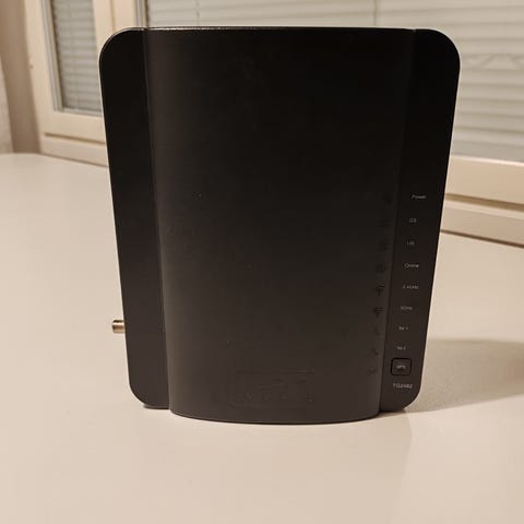Arris 2492 kaapelimodeemi. Mukana virtalähde, TV/datajaotin, tarvittavat kaapelit ja asennusohjeet.