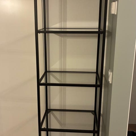 Alin ja ylin hylly puuta, muut hyllyt lasia.