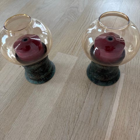 Kaksi vanhaa käsintehtyä kynttilälyhtyä. Erilaiset koristelasit.