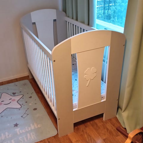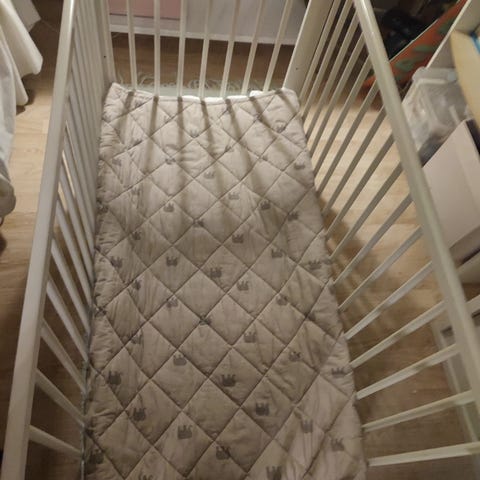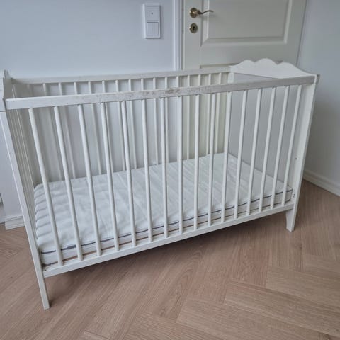 Valkoinen pinnasänky ja patja. Pinnasängyssä on kulumaa, mutta on silti päällisin puolin ihan siistin näköinen. Patja on hyvässä kunnossa ja siinä on aina ollut kosteussuoja suojaamassa tahroilta. Patja on ollut käytössä yhdellä lapsella.