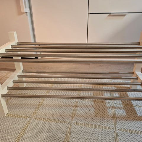 Perus metallinen kenkäteline hyvässä kunnossa.