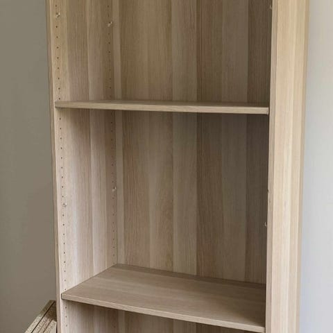 Tamminen viiden hyllyn avohyllykkö. Ylin hylly on 16cm syvä, alin 32cm