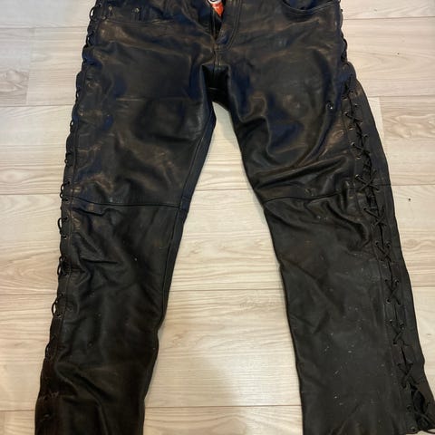 Ylimääräiseksi jääneet nahkaiset ajohousut kokoa 54, ehjät