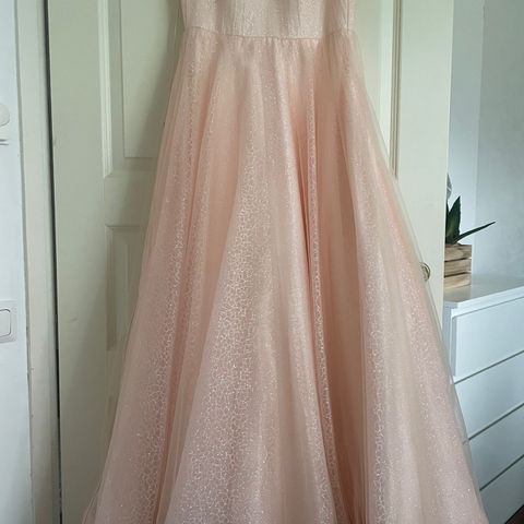 Izilady merkkinen tanssiaispuku esim. vanhojentansseihin. Takana nauha kiinnitys joten mekko menee koossa xs-m. Ollut käytössä kerran 163cm pitkällä tanssijalla joka käytti korkokenkiä. Hameosassa tylliä joten vannehametta ei tarvitse. Mekko on hyvässä kunnossa, säilytetty pukupussissa.