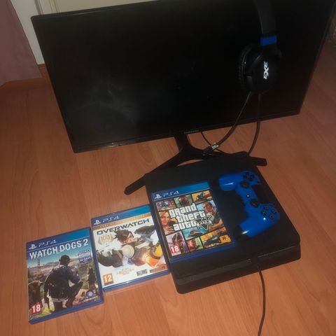 Playstation 4 pelikonsoli ohjaimilla ja peleillä