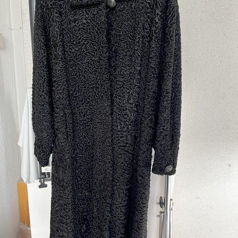 Hyväkuntoinen turkki. Ehjä vuori. Kaksi taskua sivussa. Kokonaispituus 105 cm. Hartialeveys 48 cm ja hian pituus 53 cm. Hioissa turkis, todennäköisesti minkki.
