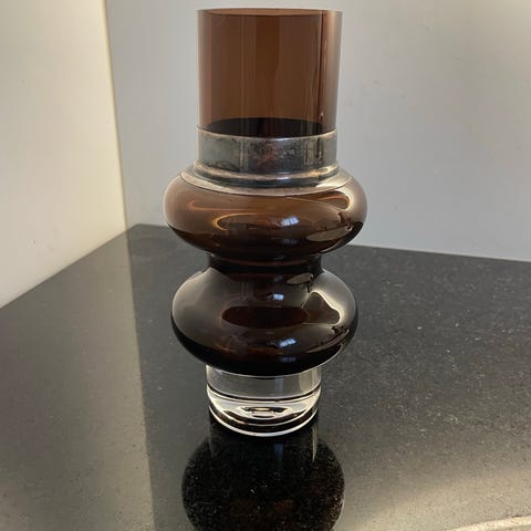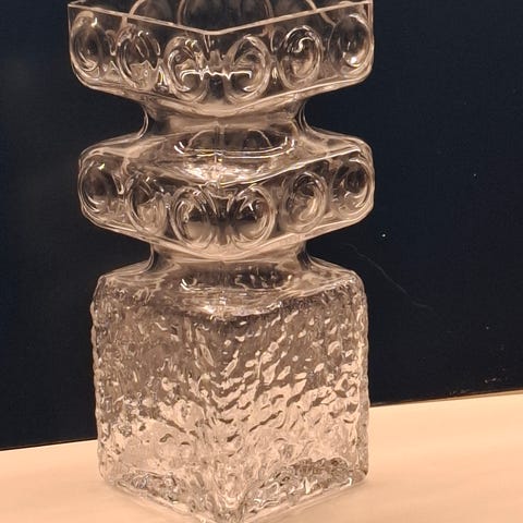 Myydään maljakko kork 28cm Presto keltainen. Lasi kirkas, hyvin vähäisiä siirtelyjälkiä pohjalla.