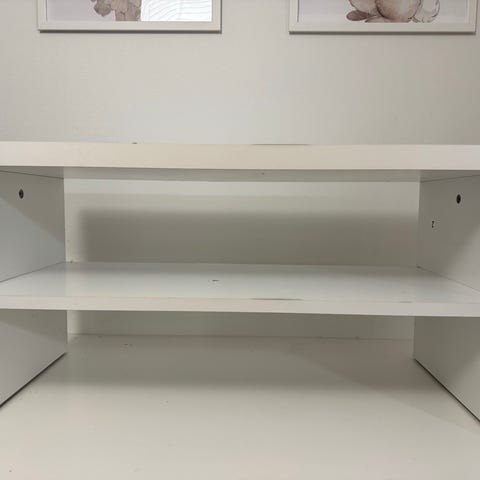 Annetaan valkoinen tv-taso kahdella vetolaatikolla.