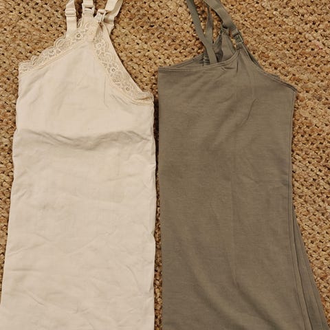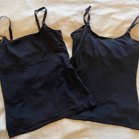Paljon käytetyt valkoinen ja musta imetystoppi. Valkoisen topin väri ei enää kaikkein kirkkain, sillä toppia on pesty kirjavan pyykin mukana. Siinä on myös jonkin verran tahraa.