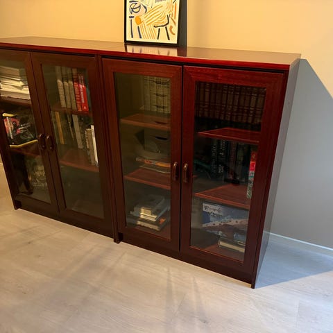 Myydään vitriini/hyllykkö joko yhdessä tai erikseen. Hinta molemmista yhteensä 40 e, erikseen 20 e/kpl. Yhden leveys 77,5 cm.