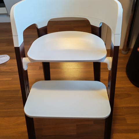 Uusi, itsetehty, säädettävä koivujalkatuki, joka sopii useisiin syöttötuoleihin. Kuvassa oleva tuoli on IKEA Antilop -syöttötuoli. Pinta on sileä eikä lakattu. Mukana tulevat kiinnikkeet.