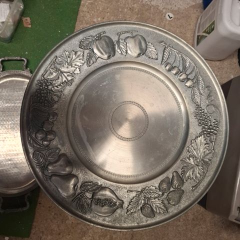 Myydään näyttävä tinatuoppi. saksalainen (95% tinaa). Toisessa reunassa kaiverrus 50v.
