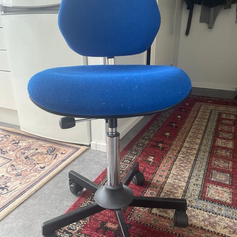 Tuoli, jossa on sininen verhoiltu istuinosa ja mustat metallijalat. Tuolissa on käsinojat, jotka ovat myös metallia. Sopii esimerkiksi keittiöön, työtilaan tai odotustilaan istuimeksi. Materiaalina on kangasverhoilu ja metallirunko.