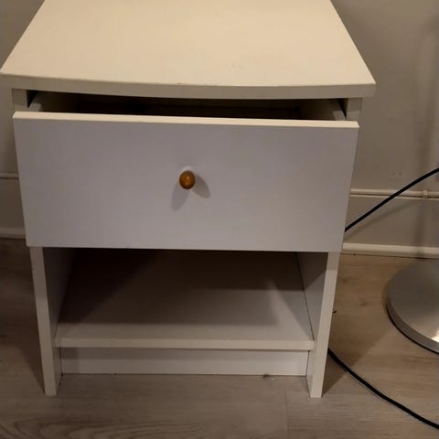 Siisti valkoinen yöpöytä. On erittäin hyvässä kunnossa. Savuton & eläimetön talous. Vetolaatikko liikkuu hyvin ja sulkeutuu hidastetusti.