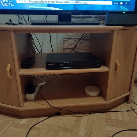Myynnissä Ikean Kallax-hyllyn pohjalle rakennettu TV-taso. Yleisilmeeltään siisti, pari pientä kolhua löytyy (näkyvät kuvissa).