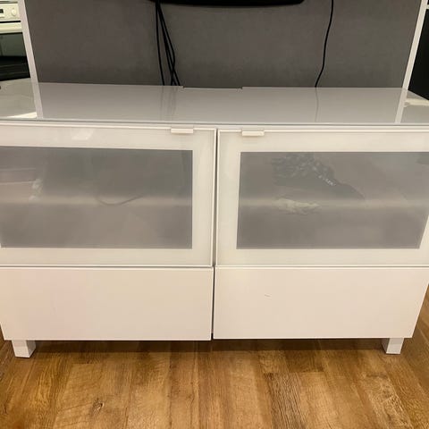 Valkoinen Bestån senkki/Tv-taso mukaan lasilevy tason päälle, 5 hyllyä, tukeva lipasto 8 jalalla. Korkeus jalkojen kera 74cm. Ei vikoja, vain nouto