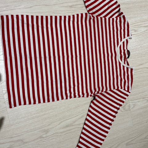 Kiva vajaahihainen Marimekon raitapaita. Taskut edessä.