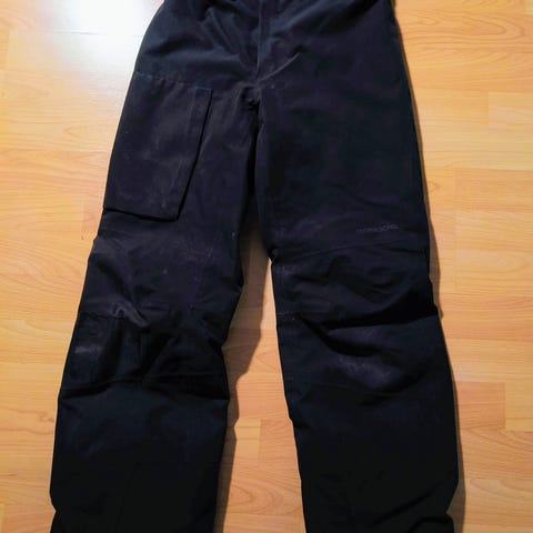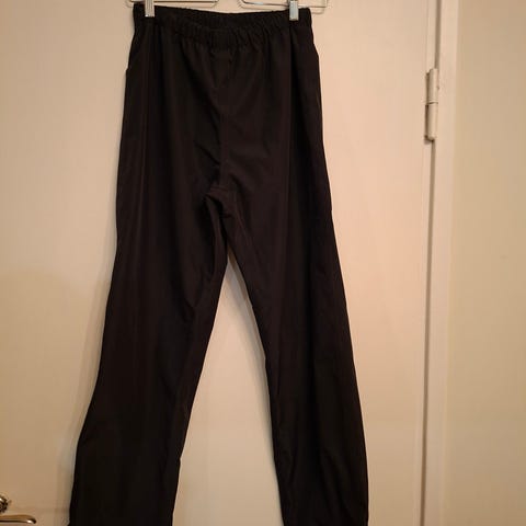Mustat nimikoidut siistissä yhden lapsen käytetyssä kunnossa olevat mustat vedenpitävät vk-housut. Joustavassa kuminauha vyötärössä kiristysnarut. Tarroilla suljettavat etutaskut sekä lahkeissa säätötarrat. Polvissa näkyy vähäistä käytön jälkiä.