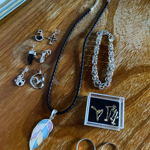 Setti erilaisia koruja - kahdet korvikset, kolme riipusta, rannekoru, kaksi sormusta ja kaulakoru. Osa vanhoja, osa uusia. Materiaalit hopea ja pronssi + rannekoru joko kiveä tai muovia. Kaulakorun ketjun pituus n. 38cm, sormusten sisähalkaisijat n. 16mm ja n. 19mm (pronssisormus on säädettävä). Kaikki korut ehjiä, siistikuntoisia ja käyttöön sopivia.
