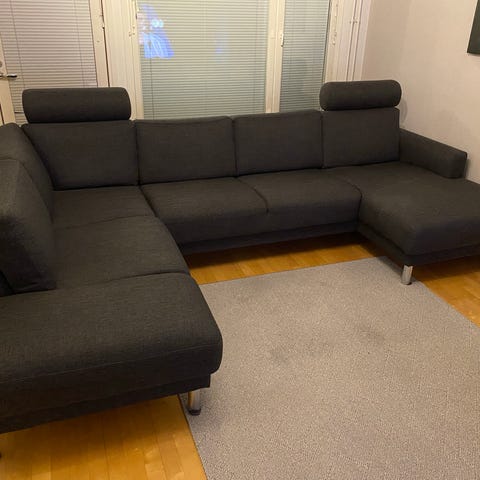 Tukeva hyvässä kunnossa oleva vaaleanharmaa avokulmasohva. Valmistettu Tanskassa. Mustat tammijalat.