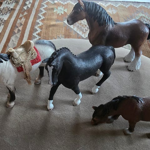Schleich heppasetti. Kolme heppaa, ukkeli, muuta tavaraa.