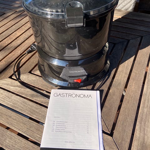 Sähkökäyttöinen perunankuorimakone. Tehokas. Kuorii noin reilun kilon kerrallaan. Helppo puhdistaa. Osat voi pestä koneessa.