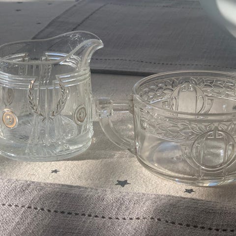 Riihimäen lasin "Lyyra" sokerikko ja kermakko. Sokerikon reunalla yhdessä kohtaa sormelle hieman karhentumaa, ei haittaa käyttöä. Yhteishinta 5€. Kuusistossa.