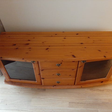 Annetaan IKEAn musta TV-taso muuton alta. Toinen sivu repsottaa (kuva, varmaankin korjattavissa), ja keskellä naarmu (kuva).