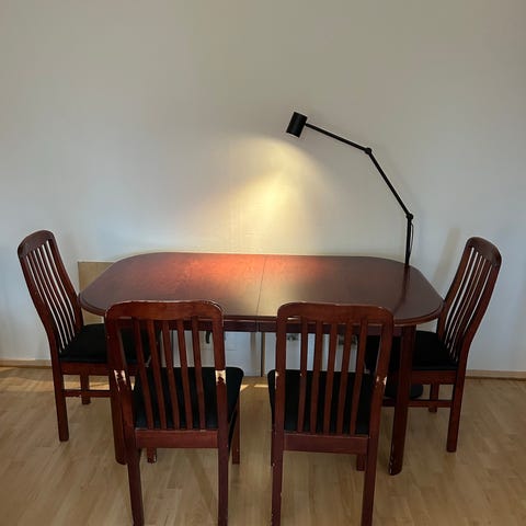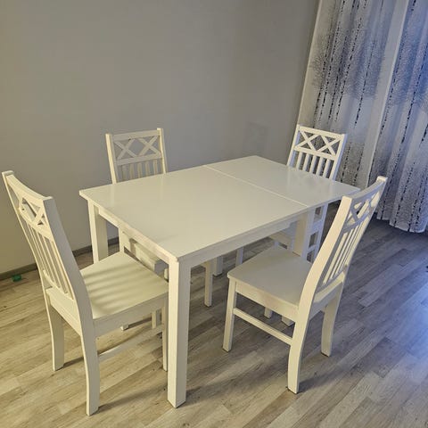 Puinen, jatkettava ruokapöytä 4 tuolilla. Pöydän pinnassa naarmuja (kuten kuvassa), mutta muuten täysin toimiva ja tukeva setti.