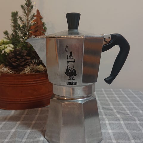 Myydään Bialetti mutteripannu, hyvässä kunnossa, mutta käytön jälkeä on. Keittää kuusi kuppia espressoa. Tiskattu asianmukaisesti käsin etikkaliuoksella ilman tiskiaineita. Mukaan tulee myös yksi vaihdettava suodatinosa.