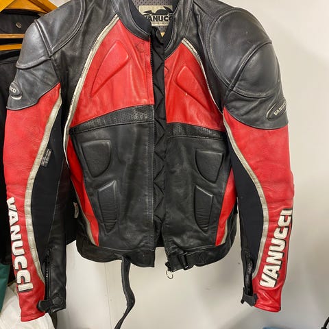 Vanuccin takki(XXL) ja housut(XL).Erittäin siistit.Huom! Myytävänä myös erikseen Schubertin kypärä ja ajokengät.