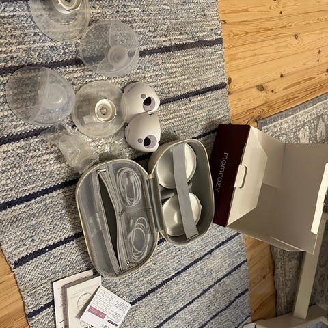 Puettava rintapumppu lisäosineen. Toisen moottorin imuteho heikko mutta osat käyvät kumpaankin pumppuun. Usb-c lataus.