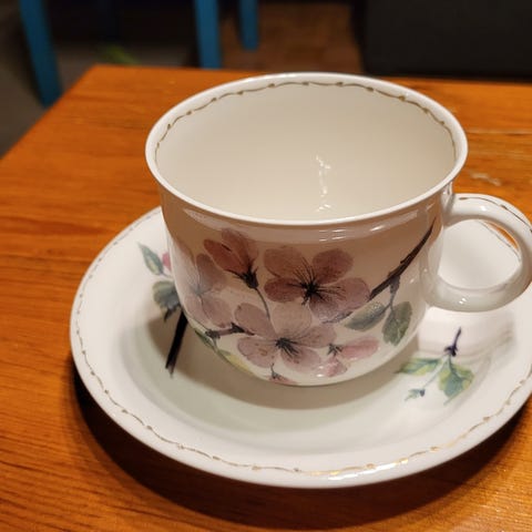 Kaunis tumma, lähes musta sinivihreä lasite pystysuuntaisella kuvioinnilla. Valkoinen sisäpinta ja kahva.