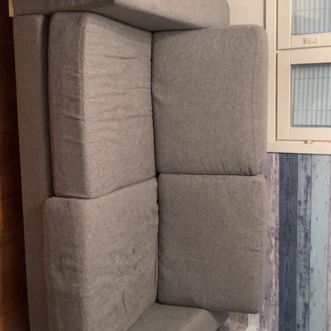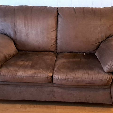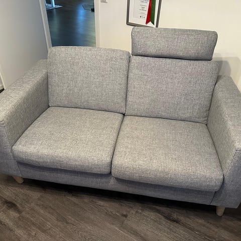 Mukava istua, tukeva ja vahva 2 hengen sohva. Istuinosassa joitain himmeitä tahroja, pesu jää ostajalle.