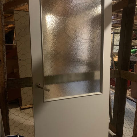 Annetaan valkoinen sisäovi. Ovi on varustettu metallisella ovenkahvalla, jossa puinen yksityiskohta ja lukolla. Avainta lukkoon ei ole. Soveltuu sisäkäyttöön.