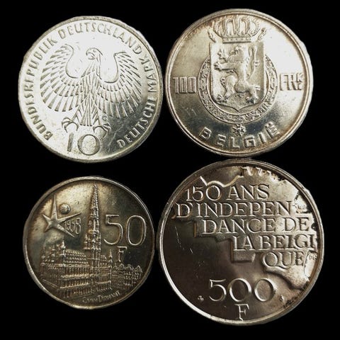 Hopeisten kolikoiden kokoelma albumeineen - 14 hopeakolikkoa, Caravellen, Dante Alighierin, Sveitsin frangin ja 10 euron Saksan ajalta. Kunto on vaihteleva, mutta hyvin säilynyt, vuodelta 1945 eteenpäin. Katso huolellisesti kaikkia valokuvia.