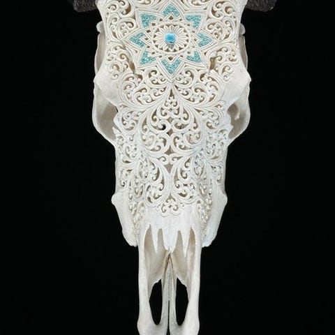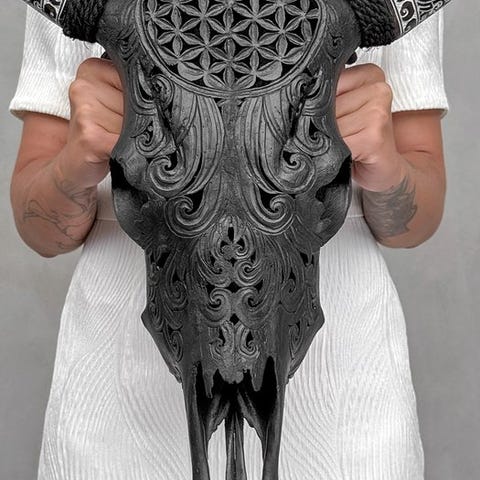 Käsin kaiverrettu lehmänkallo, jonka ovat kaivertaneet käsityöläiset, jotka siirsivät muinaisen kaiverrustaidon isältä pojalle. Kallo on veistetty kokonaan käsin huolella. Se on epätavallinen, koristeellinen kappale.