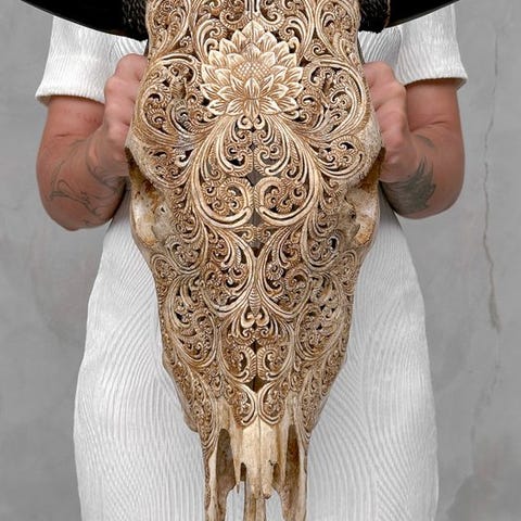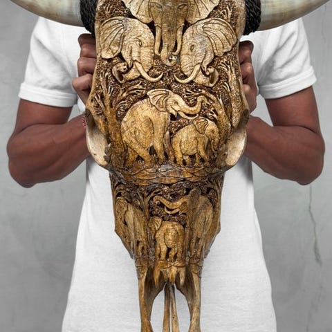 Käsin kaiverrettu suuri härkäkallo, jonka ovat kaivertaneet taiteilijat, jotka ovat siirtäneet kaiverruksen muinaisen taidon isältä pojalle. Kallo on täysin käsin veistetty suurella huolella. Se on epätavallinen, koristeellinen kappale.