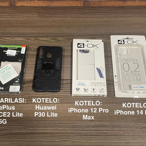 Ylärivin kaksi vasenta kuorta ovat OnePlus 12 puhelimeen sopivia kuoria, loput Iphone 14 pro max puhelimeen sopivia