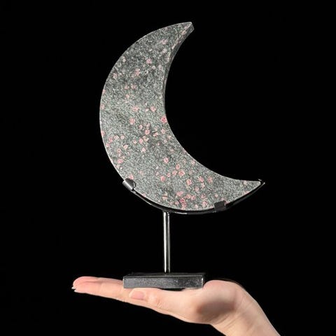 Kauniisti kiillotettu puolikuu-muotoinen, karkeasta keltaisesta maligano jasperista valmistettu, räätälöityyn jalustaan asetettu.