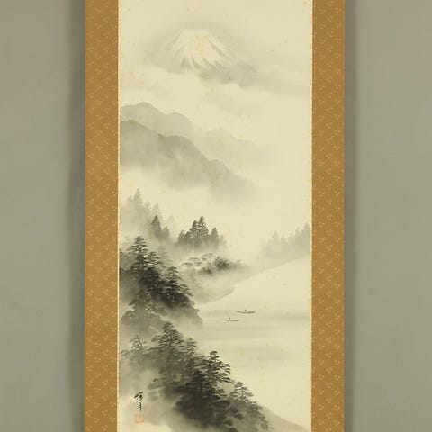 Tämä Araki Jippon (1872–1944) – Kioton taidemaailman johtavan taidemaalarin ja Shijō-koulukunnan keskeisen hahmon – hienostunut riippuva kirjakäärö tarjoaa seesteisen ja runollisen näkemyksen japanilaisesta syksystä. Vaivattomalla siveltimenvedolla ja hienostuneella hillityllä tavalla Jippo kuvaa herkkää syysruohojen suihkua, yhtä sinistä kelloa ja kauniisti kaartuvaa kuunsirppiä luoden sommitelman, joka on sekä avara että syvän tunnelmallinen. Jippon ominainen eleganssi on tässä täysin läsnä: äärimmäisen hienot musteviivat, pehmeä värien modulaatio ja runsas negatiivinen tila herättävät henkiin alkusyksyn öiden hiljaisen kauneuden. Kohtaus ilmentää klassista japanilaista wabi-sabi-estettiikkaa – rauhallisuuden, vuodenaikojen vaihtelun ja hienostuneen yksinkertaisuuden tunnetta. Kirjakääröä seuraa sen alkuperäinen signeerattu tomobako (puinen säilytyslaatikko), jossa on taiteilijan kaiverrus ja sinetti. Tämä korostaa sekä taideteoksen aitoutta että sen arvoa keräilijöille. Siro ja mietiskelevä teos, joka tuo japanilaisten vuodenaikojen runouden mihin tahansa sisustukseen.